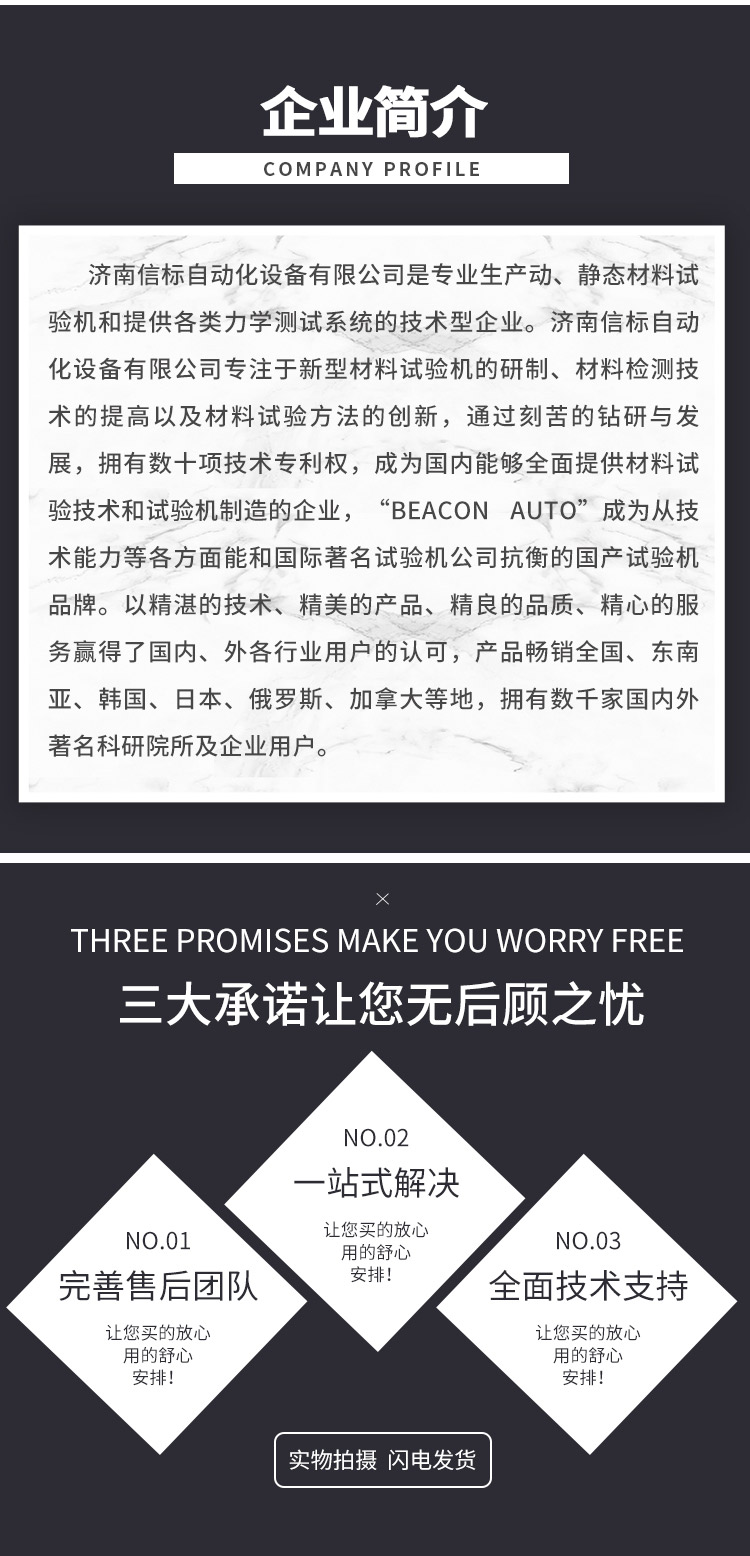 濟南信標自動化設備有限公司主要生產:動靜態萬能疲勞試驗機,接骨板彎曲試驗機,縫合線拉伸疲勞試驗機,髖膝關節磨損試驗機,電子萬能試驗機、液壓萬能試驗機、巖石三軸、四軸,電液拉力試驗機,材料試驗機,高低溫蠕變,高低頻疲勞,拉伸、扭轉、杯突等二十多個系列兩千多個的品種。