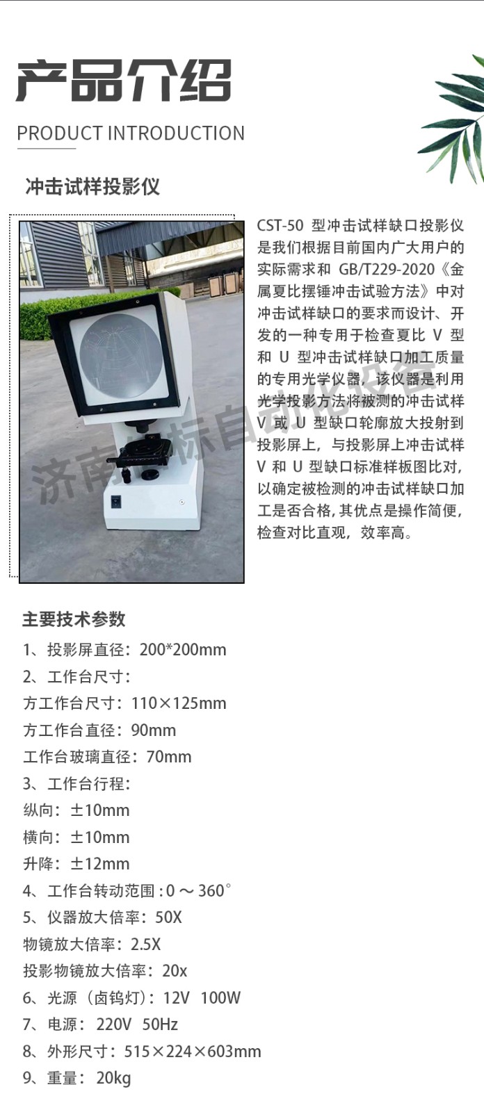應(yīng)用領(lǐng)域 CST-50型沖擊試樣缺口投影儀是我們根據(jù)目前國內(nèi)廣大用戶的實際需求和GB/T229-2020《金屬夏比擺錘沖擊試驗方法》中對沖擊試樣缺口的要求而設(shè)計、開發(fā)的一種專用于檢查夏比V型和U型沖擊試樣缺口加工質(zhì)量的專用光學(xué)儀器,該儀器是利用光學(xué)投影方法將被測的沖擊試樣V或U型缺口輪廓放大投射到投影屏上,與投影屏上沖擊試樣V和U型缺口標準樣板圖比對,以確定被檢測的沖擊試樣缺口加工是否合格,其優(yōu)點是操作簡便,檢查對比直觀,效率高。 三、主要技術(shù)指標: 1、投影屏直徑 :200*200mm 2、工作臺尺寸 : 方工作臺尺寸:110×125mm 方工作臺直徑:90mm 工作臺玻璃直徑:70mm 3、工作臺行程 : 縱向:±10mm 橫向:±10mm 升降:±12mm 4、工作臺轉(zhuǎn)動范圍: 0~360° 5、儀器放大倍率:50X 物鏡放大倍率: 2.5X 投影物鏡放大倍率:20x 6、光源(鹵鎢燈):12V 100W 7、電源: 220V 50Hz 8、外形尺寸:515×224×603mm 9、重量: 20kg 四、設(shè)備主要配置: 1.CST-50投影儀主機 一臺 2.底座調(diào)整鈕 四個 3.電源線 一根 4.鹵鎢燈 二個 5.平板玻璃 一塊 五、工作條件 a、環(huán)境溫度0-25oC范圍內(nèi); b、相對濕度不大于85 %; c、周圍無腐蝕性介質(zhì)的環(huán)境中; d、安裝在平整的地面上; a、環(huán)境溫度0-25oC范圍內(nèi); b、相對濕度不大于85 %; c、周圍無腐蝕性介質(zhì)的環(huán)境中; d、安裝在平整的地面上;