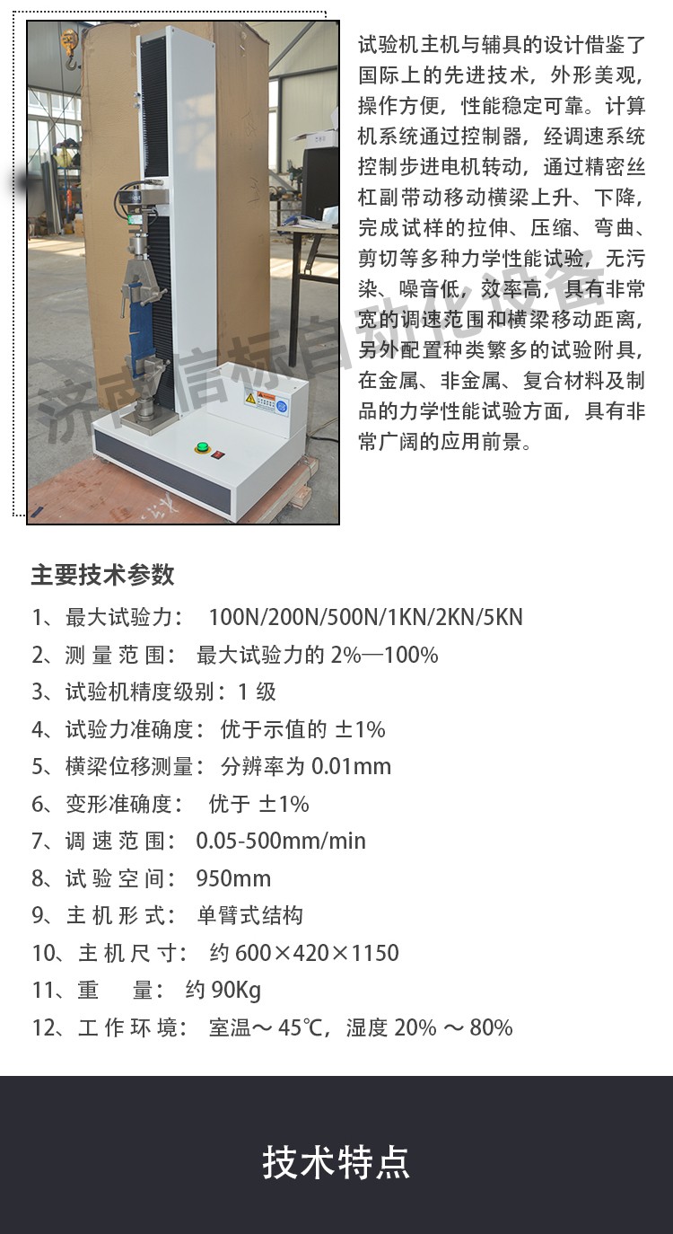 主要功能及特點: 1、主機: 1.1調速系統采用伺服電機和自主研發減速系統,性能穩定可靠,具有過流、過壓、過載等保護裝置。調速范圍可達0.05~500mm/min。 1.2傳動部分采用圓弧同步齒形帶,精密絲杠副傳動,傳動平穩,噪音低,傳動效率高。 1.3萬向節采用十字插銷結構,而且具有擺角限制功能,一方面便于試樣夾持,保證試驗同心度,另一方面很好的消除了不規則試樣對傳感器的影響。 2、控制系統、操作軟件及數據處理系統 2.1計算機控制系統,具有集成度高、性能穩定、調整方便等優點。可以對實驗數據進行實時采集,對實驗特性曲線實現實時動態顯示,試驗數據文件能以Access常用數據庫或SQLserve大型數據庫的方式保存,方便實現客戶的資源共享及網絡管理,以及用戶的再分析。對于用戶自定義的各種word2000報表,該軟件可輕松實現訪問,解決了不同用戶或同一用戶在不同時期對試驗報表有不同需要的難題。該軟件可處理試驗力、位移、 時間、變形的原始數據及由此派生的曲線。 2.2保護功能:該機具有軟件和機械兩種限位保護方式,超過最大負荷自動停機的比例可動態設定;具有過流、過壓、過載等多種保護功能。 2.3對于負荷、變形通道可實現自動標示,直觀方便。 2.4批量試驗可實現曲線的分層次顯示,曲線自動跟隨。 2.5該軟件可實現用戶自定義的速度設定,速度的計算機調整。還可實現高精度的速度標定,隨時調整速度檔位和編碼。