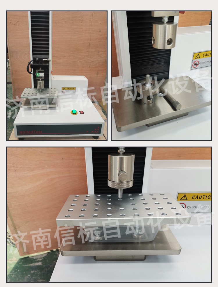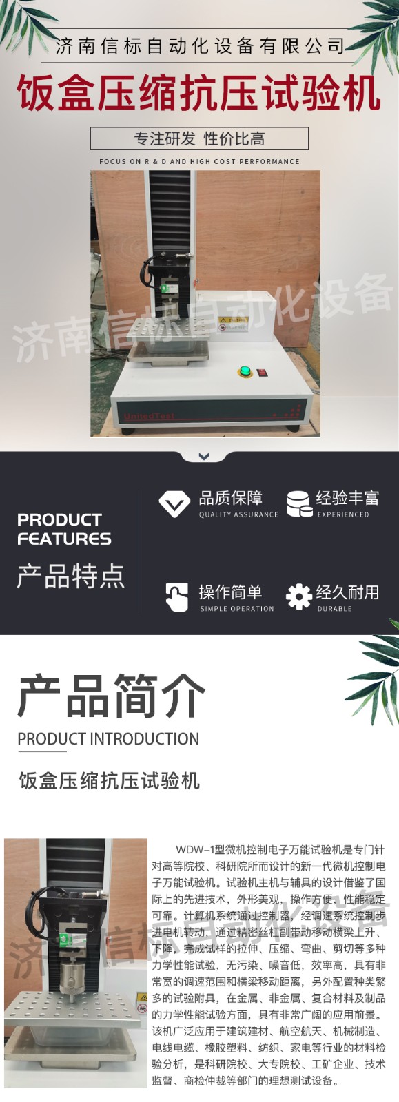 飯盒壓縮抗壓試驗(yàn)機(jī) 單臂壓力萬(wàn)能試驗(yàn)機(jī)主要技術(shù)指標(biāo): 1、 最大試驗(yàn)力: 100N/200N/500N/1KN/2KN/5KN 2、 測(cè) 量 范 圍: 最大試驗(yàn)力的2%—100% 3、 試驗(yàn)機(jī)精度級(jí)別:1級(jí) 4、 試驗(yàn)力準(zhǔn)確度: 優(yōu)于示值的±1% 5、 橫梁位移測(cè)量: 分辨率為0.01mm 6、 變形準(zhǔn)確度: 優(yōu)于±1% 7、 調(diào) 速 范 圍: 0.05-500mm/min 8、 試 驗(yàn) 空 間: 950mm 9、 主 機(jī) 形 式: 單臂式結(jié)構(gòu) 10、 主 機(jī) 尺 寸: 約600×420×1150 11、 重 量: 約90Kg 12、 工 作 環(huán) 境: 室溫~45℃,濕度20%~80% 飯盒壓縮抗壓試驗(yàn)機(jī) 單臂壓力萬(wàn)能試驗(yàn)機(jī)主要功能及特點(diǎn): 主機(jī): 1.1調(diào)速系統(tǒng)采用伺服電機(jī)和自主研發(fā)減速系統(tǒng),性能穩(wěn)定可靠,具有過(guò)流、過(guò)壓、過(guò)載等保護(hù)裝置。調(diào)速范圍可達(dá)0.05~500mm/min。 1.2傳動(dòng)部分采用圓弧同步齒形帶,精密絲杠副傳動(dòng),傳動(dòng)平穩(wěn),噪音低,傳動(dòng)效率高。 1.3萬(wàn)向節(jié)采用十字插銷結(jié)構(gòu),而且具有擺角限制功能,一方面便于試樣夾持,保證試驗(yàn)同心度,另一方面很好的消除了不規(guī)則試樣對(duì)傳感器的影響。 2、控制系統(tǒng)、操作軟件及數(shù)據(jù)處理系統(tǒng) 2.1計(jì)算機(jī)控制系統(tǒng),具有集成度高、性能穩(wěn)定、調(diào)整方便等優(yōu)點(diǎn)。可以對(duì)實(shí)驗(yàn)數(shù)據(jù)進(jìn)行實(shí)時(shí)采集,對(duì)實(shí)驗(yàn)特性曲線實(shí)現(xiàn)實(shí)時(shí)動(dòng)態(tài)顯示,試驗(yàn)數(shù)據(jù)文件能以Access常用數(shù)據(jù)庫(kù)或SQLserve大型數(shù)據(jù)庫(kù)的方式保存,方便實(shí)現(xiàn)客戶的資源共享及網(wǎng)絡(luò)管理,以及用戶的再分析。對(duì)于用戶自定義的各種word2000報(bào)表,該軟件可輕松實(shí)現(xiàn)訪問(wèn),解決了不同用戶或同一用戶在不同時(shí)期對(duì)試驗(yàn)報(bào)表有不同需要的難題。該軟件可處理試驗(yàn)力、位移、 時(shí)間、變形的原始數(shù)據(jù)及由此派生的曲線。