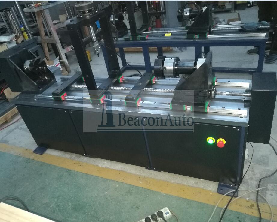 主要技術指標 試驗及級別:1級 最大拉伸試驗力: 10000N 最大試驗扭矩: 50 Nm 最大徑向試驗力: 500N 位移最小讀數:0.01mm 位移最大讀數:600.00mm 角位移最大讀數:999.99度 角位移最小讀數:0.1度 最大行程:1200mm 電源:220V 50Hz 扭轉部分: 1.軸流風扇靜態扭轉試驗機項目簡介 扭轉部分是由加載系統、傳動系統、數字式數據采集處理系統及計算機測量控制顯示系統等組成,適用于對軸流風扇靜態扭轉力學的性能測試。該機采用落地臥式結構。計算機屏幕顯示,數字式數據采集控制系統和全數字交流伺服系統組成閉環控制。采用行星擺線針輪減速器傳動,具有加載均勻、穩定、無沖擊現象、數據采集控制準確的特點。 試驗測試功能:Win2000/XP中文操作平臺。使用以圖形為界面的視窗式操作系統,可設定顯示屏幕及操作面板;可設定試驗速度及各種控制參數;可實時顯示基本試驗結果(斷裂值、峰值);可實時顯示試驗過程各種相關參數圖形;可實現系統診斷并顯示診斷結果。試驗機實現分級管理權限。不同的用戶可進入不同的管理界面、分三級用戶管理權限。 整機利用全數字交流伺服控制系統及數字式數據采集處理系統,光電編碼器采集試樣的扭轉角度。 2.目的: 軸流風扇的靜態扭轉實驗 3.軸流風扇靜態扭轉試驗機方案描述 【主 機】采用臥式結構,主體結構采用焊接結構,以保證整機的剛性。夾具采用優質合金結構鋼40CrNiMoA淬火(HRC45~50)方式,主傳動軸采用優質合金結構鋼淬火處理,保證其使用壽命。試樣的安裝、拆卸方便、快捷。 【驅動系統】由全數字交流伺服控制系統驅動。速度調節范圍寬,加載均勻、穩定。 【傳動系統】采用行星擺線針輪減速器傳動,保證傳動的均勻、穩定及傳動精度??v向空間可以根據汽車半軸的規格進行調整,橫向空間根據驅動橋的規格任意手動調節。 【測量顯示系統】該機采用光電編碼器采集試樣的扭轉角度,高精度扭矩傳感器采集試樣的扭矩。計算機屏幕顯示試樣的扭矩、扭轉角度、扭轉剛度以及各類曲線等。 【軟件操作】 ★控制模式采用智能專家設置系統,用戶可以根據自己的實際要求編制試驗過程控制方式,自動完成試驗。 ★ Windows2000/XP全中文界面,人機對話方式。試驗的全部操作均借助CRT,通過計算機鍵盤與鼠標完成,計算機屏幕顯示試驗扭矩T,扭轉角度θ,扭轉次數,各種試驗曲線(扭矩-時間曲線、扭矩-角度曲線、角度-時間曲線等)試驗機工作狀態等。 ★曲線坐標的大小可以根據實際的試驗數據進行調整。 ★輸出打印各種試驗報表格式(報表格式可以Excel或Word格式輸出)。 ★符合JB/T9370—1999《扭轉試驗機技術條件》及GB10128—88《金屬室溫扭轉試驗方法》數據處理的相關要求。 ★可以設定以正弦波或方波的方式進行循環加載。 ★ 試驗過程可以實現模擬再現。 ★ 可以任意多條試驗曲線疊加對比、輸出打印。 ★ 可以進行數字化調零和標定。 ★ 試驗數據采用數據庫管理方式,便于查詢和維護。 ★ 軟件系統的操作可以實現三級用戶管理,安全、方便、快捷。 【安全保護系統】過載保護、過電流、過電壓保護、超速保護、工作值保護、行進保護等。 4.主要技術性能指標: 4. 1大輸出扭矩:±50Nm;測量范圍:±0.1~±50Nm 4. 2驗扭矩示值相對誤差:±1% 4.3試驗扭矩重復性相對示值誤差:≤1% 4.4扭矩測量范圍:1%~100% 4.5縱向空間:0~1200mm可調 4. 6轉角度分辯率:0.10; 4. 7加載方式:可以設定以一定速度或扭距進行持續加載。 4. 8加載速度:0.005~3r/min任意設定 4. 9加載控制精度為:±2% 4. 10壓電壓:AC380V 50Hz 5.軸流風扇靜態扭轉試驗機功能要求: 5.1系統集成、加載、操作運行控制由計算機控制,試驗過程的數據采集、記錄由計算機完成,可以實現試驗數據回放,報表輸出; 5.2加載量在設備性能指標的范圍內連續可調穩定輸出; 5.3試驗控制操作集中在控制臺(柜),采用單人坐式操作;試驗件安裝調整符合操作人員立式操作的要求;試驗工裝需要必要的旋轉功能,方便主減齒輪試驗時主減速器的安裝、拆卸; 二軸向及徑向加載部分 1.1全數字交流伺服電機和伺服驅動器,調速比可達1:30;該系統控制精度高、穩定性好,運行平穩可靠、響應快、噪音低,并具有過載、過流、過壓、欠壓、過熱、 異常停止、故障報警等齊全的保護功能,并可根據不同的機型和試驗類型調整參數,使伺服系統運行在最佳狀態,使用了伺服系統的位置控制方式,接口單元實現了數字化,克服了速度環帶來的零漂移和低速不穩定。 1.2 采用精密絲杠和精密減速機構傳動,傳動平穩、噪音低,無間隙。 2、軸流風扇靜態扭轉試驗機測控系統、操作軟件及數據處理系統 高精度數據采集板(24位A/D數據采集)可實現全數字化調整、高精度放大及精確控制(內置于計算機內),先進的芯片集成技術,高精度±300000碼采集卡,使傳感器的測量精度發揮到極致。具有集成度高、穩定可靠、使用方便等優點??刂栖浖軐崿F自動求取彈性模量、屈服強度、抗拉強度、斷裂強度等常規數據,能自動計算試驗過程中任一指定點的力、應力、位移、變形等數據結果。 2.1 自動清零:試驗開始后,測量系統自動調零; 2.2 自動停機:試樣斷裂后,移動橫梁自動停止; 2.3 自動標定:系統可自動實現示值準確度的標定; 2.4 自動存盤:試驗數據和試驗條件自動存盤,杜絕因忘記存盤而引起的數據丟失; 2.5 自動變速:試驗過程中橫梁移動速度可按預先